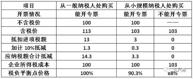 結論:在能取得增值稅專用發(fā)票的情況下,小規(guī)模納稅人的含稅價應該比一般納稅人便宜3.3元(價格為一般納稅人價格的96.9%);價格高于96.9%,從一般納稅人處購買更合算,反則反之。如果小規(guī)模納稅人不能開專票,小規(guī)模納稅人的含稅價應該比一般納稅人便宜5.85元(價格為一般納稅人價格的94.5%);價格高于94.5%,從一般納稅人處購買更合算,反則反之。